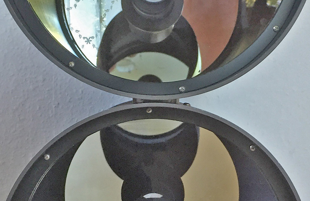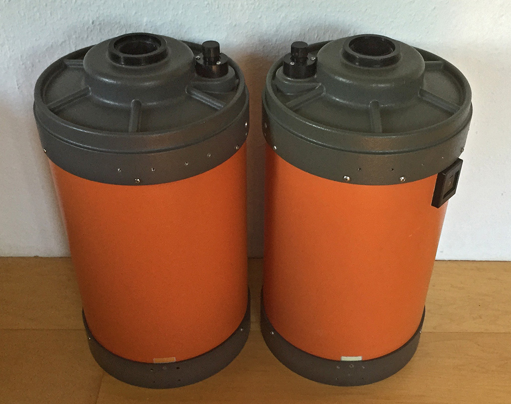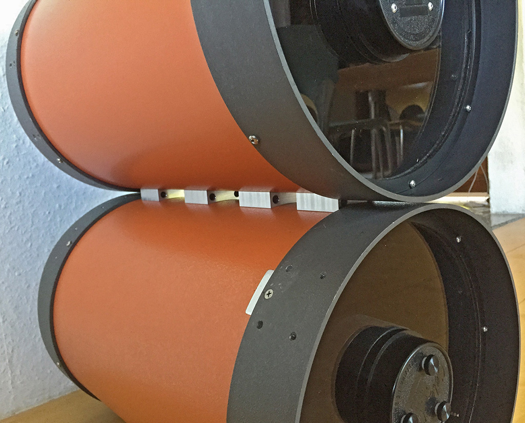 Nach 8 kommt 11 - natuerlich gab ich auch nach dem Erfolg mit dem Doppel C8 noch keine Ruhe, etwas mehr musste schon noch gehen. Beim C11 wird es aber schon recht knapp, durch den grossen Tubusdurchmesser ist der benoetigte Weg zum Augenabstand und somit der notwendige Backfokus schon recht gross, aber durch den kurzen Lichtweg in den EMS geht es sich gerade noch eben so aus ohne in die Problemzone zu kommen Es beginnt wieder mit 2 alten orange tubes, dieses mal eine Nummer groesser...