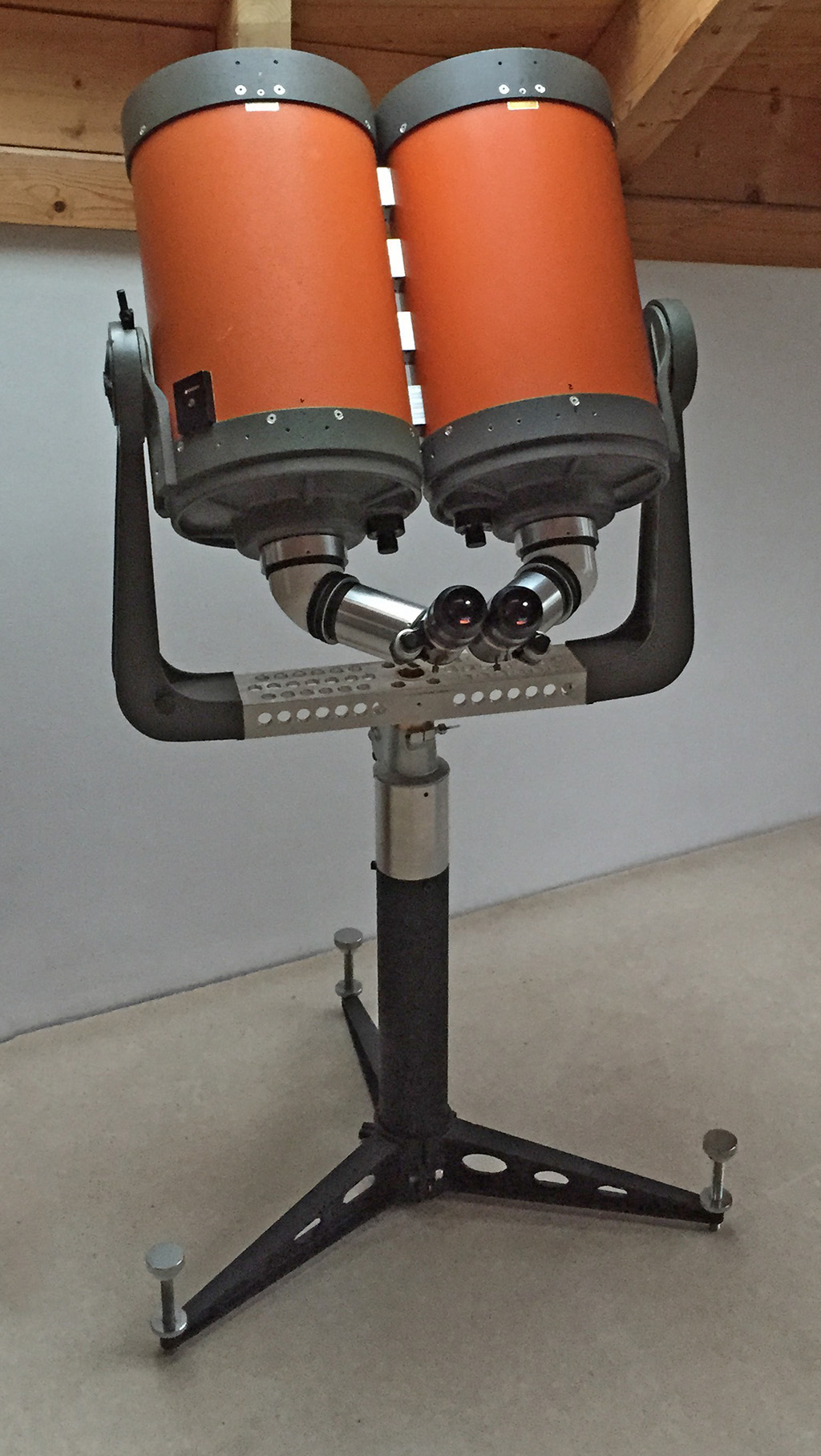 Hier das fertige Teleskop auf der Saeule. Gut zu sehen auch die Verlaengerungen zwischen den beiden EMS Gehaeusen fuer den Augenabstand