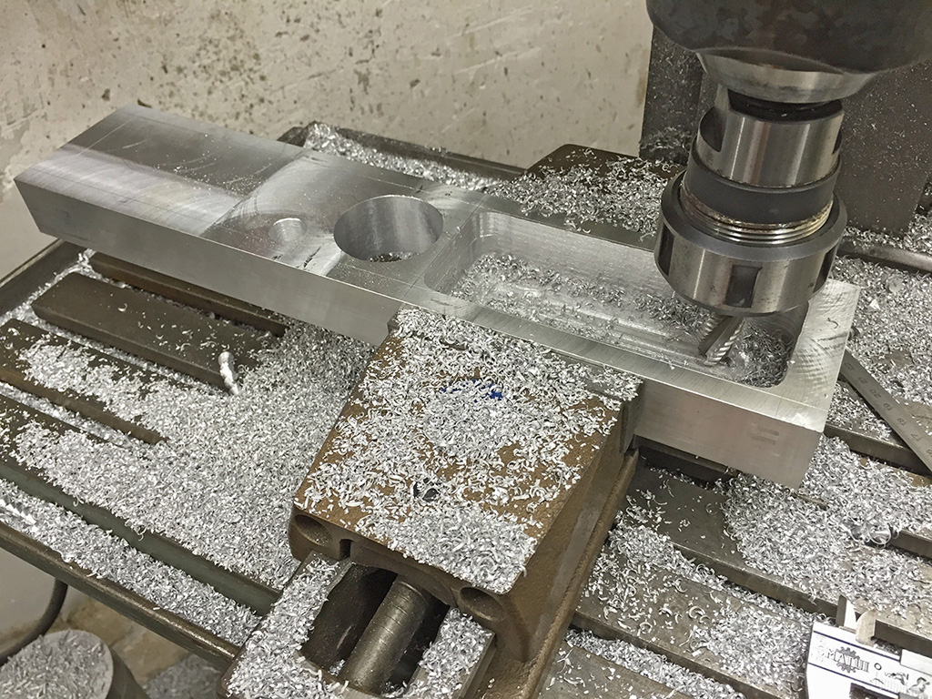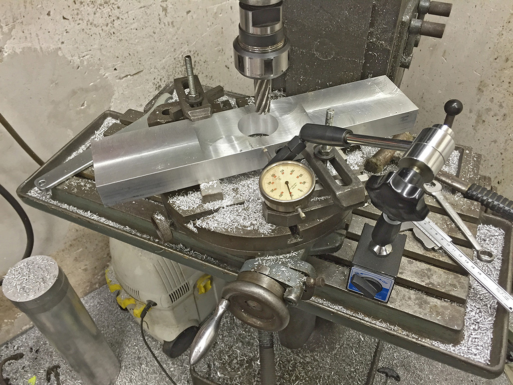 Hier fraese ich auf dem Rundtisch die zentrale Bohrung fuer das Horizontallager in die Gabelverbreiterung.